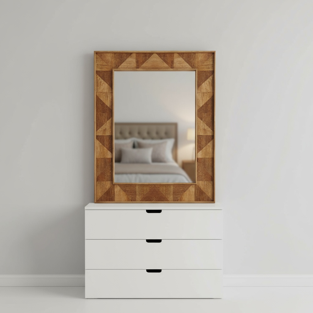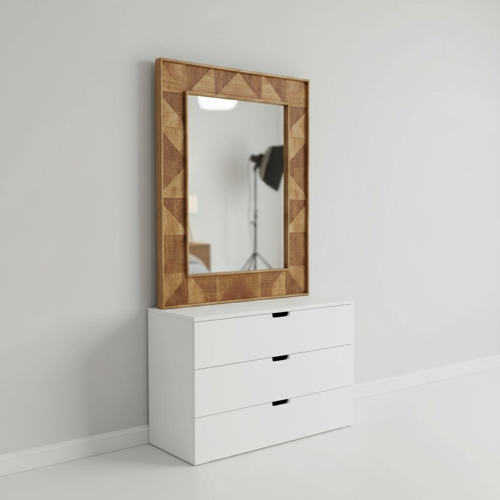 Add a touch of modern craftsmanship to your walls with this handcrafted geometrical pattern mirror frame, made from solid wood and finished in a smooth natural polish. Perfect for minimalist, rustic, or contemporary interiors.