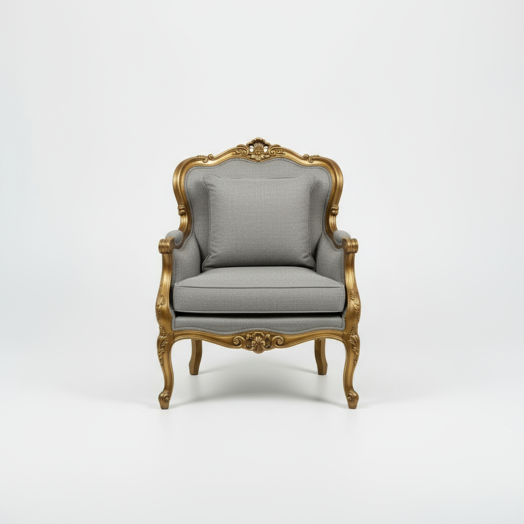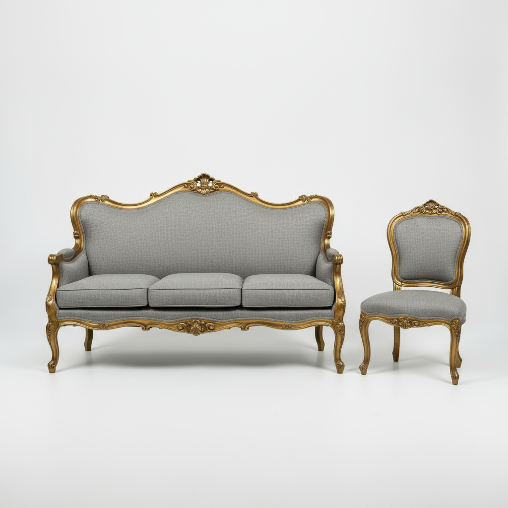 The entire sofa set is finished in an elegant golden polish, giving it a majestic, royal appeal that complements both traditional and modern interiors. The soft grey upholstery adds a touch of sophistication, balancing the richness of gold with contemporary charm.