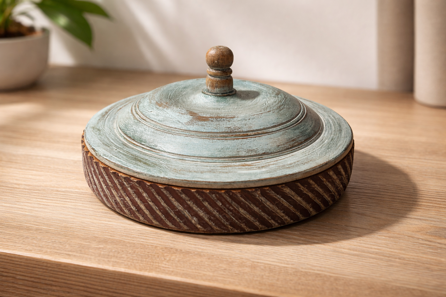 This handcrafted round wooden box combines rustic charm with refined detailing. Designed with a beautifully textured carved base and a distressed vintage-finish lid, it offers both decorative appeal and practical storage.