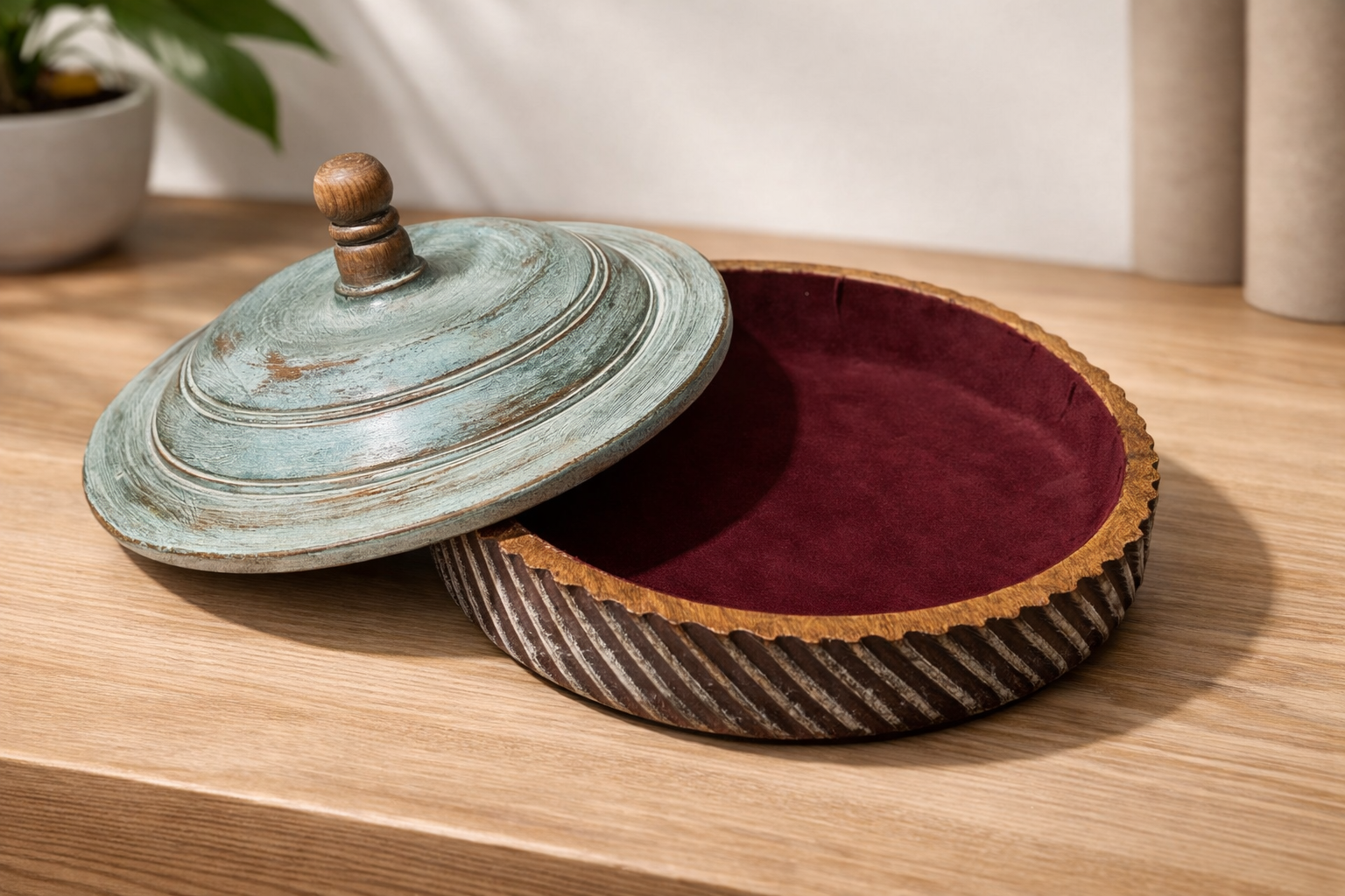 Handcrafted round wooden keepsake box with carved base and velvet-lined interior. Rustic vintage finish makes it perfect for jewelry storage, gifting, or decorative display.